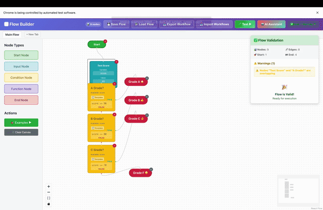 - Node Types: 5 specialized workflow components (Start, Input, Condition, Function, End)